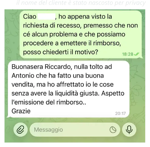 Attribuiamo particolare rilevanza alla corretta gestione delle eventuali situazioni di insoddisfazione manifestate dai Clienti, nel rispetto dei principi di buona fede, correttezza e trasparenza. Ci teniamo dunque a dare dimostrazione della procedura che seguiamo quando si presentano casi simili. Tali casi - siamo lieti di dichiarare - sono inferiori al 1% dei clienti